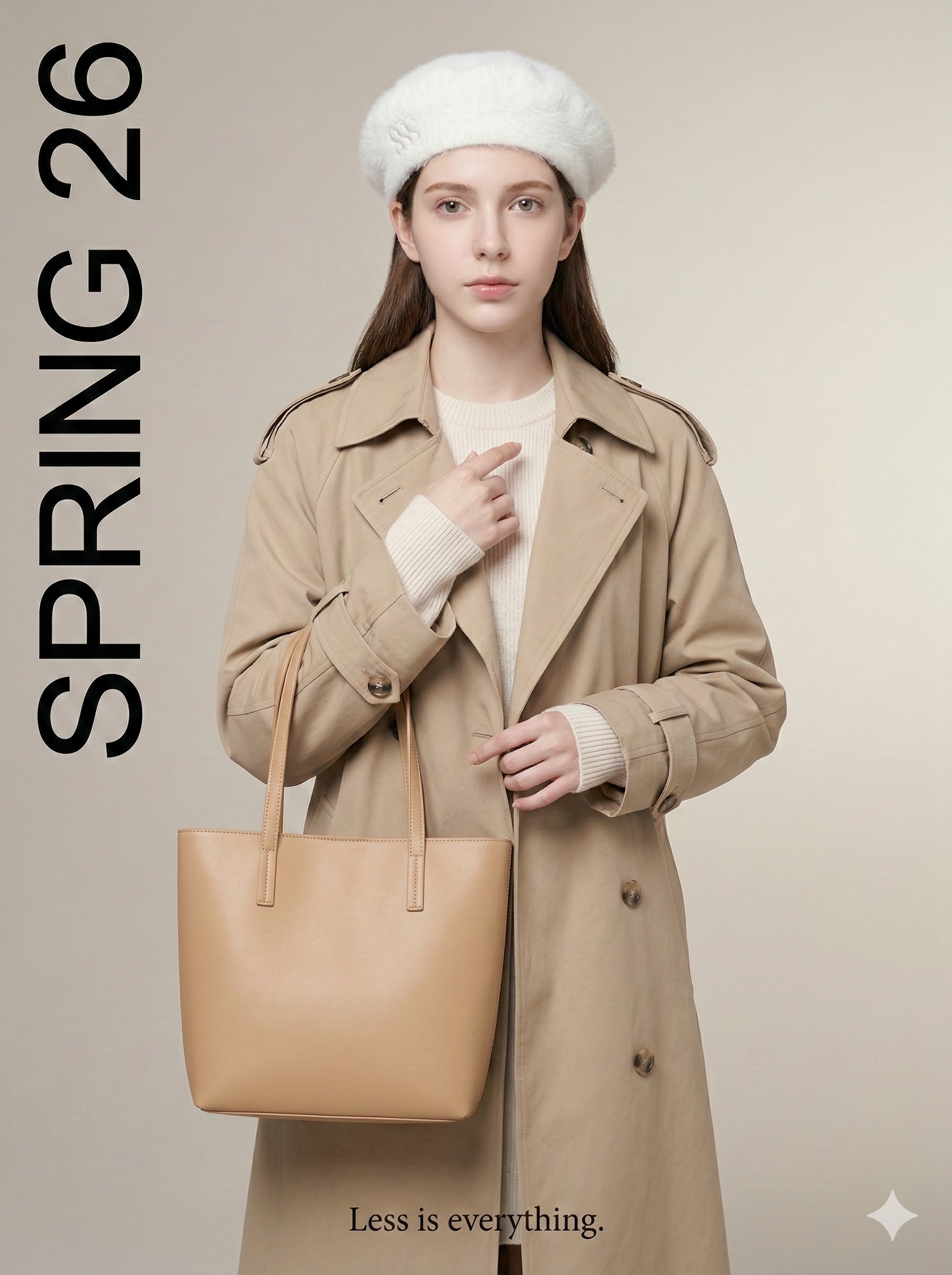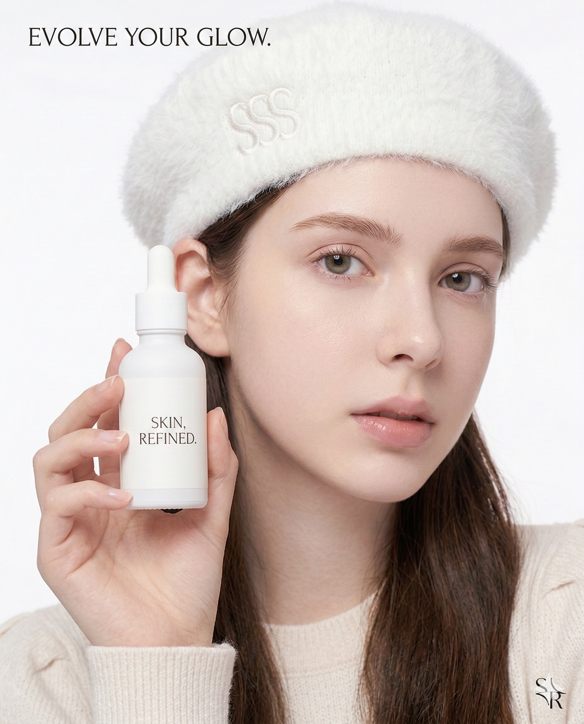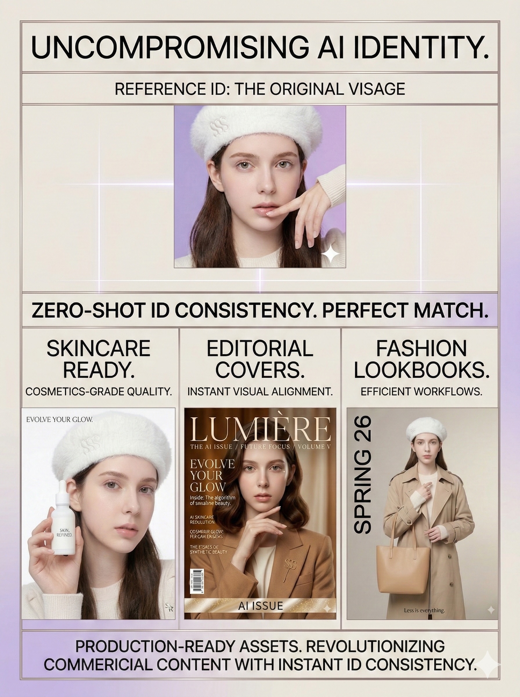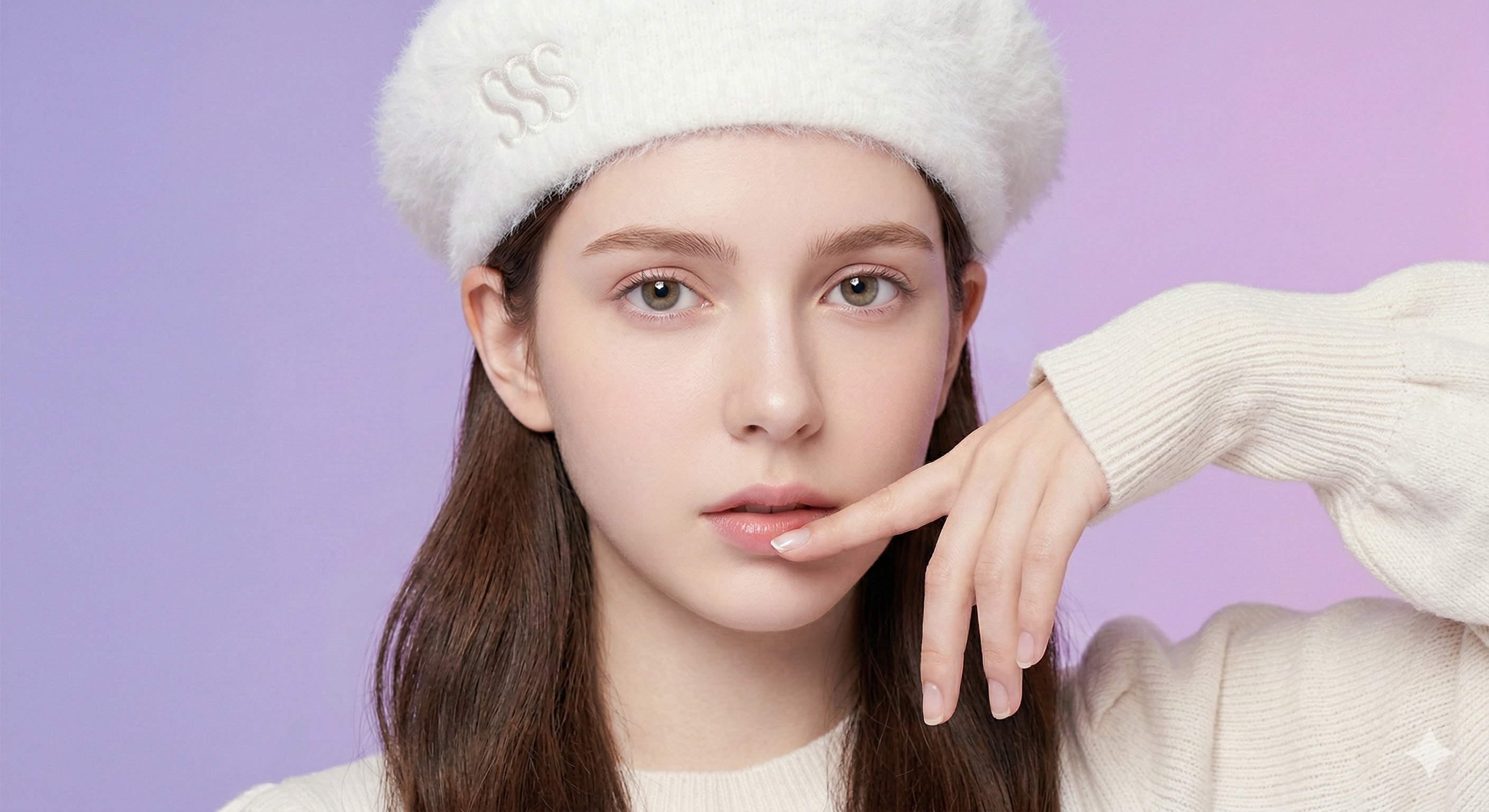 Notice the specific facial features and the delicate "SSS" embroidery on the fluffy white beret. Your AI virtual model will maintain these exact details across entirely different AI commercial photography shoots.