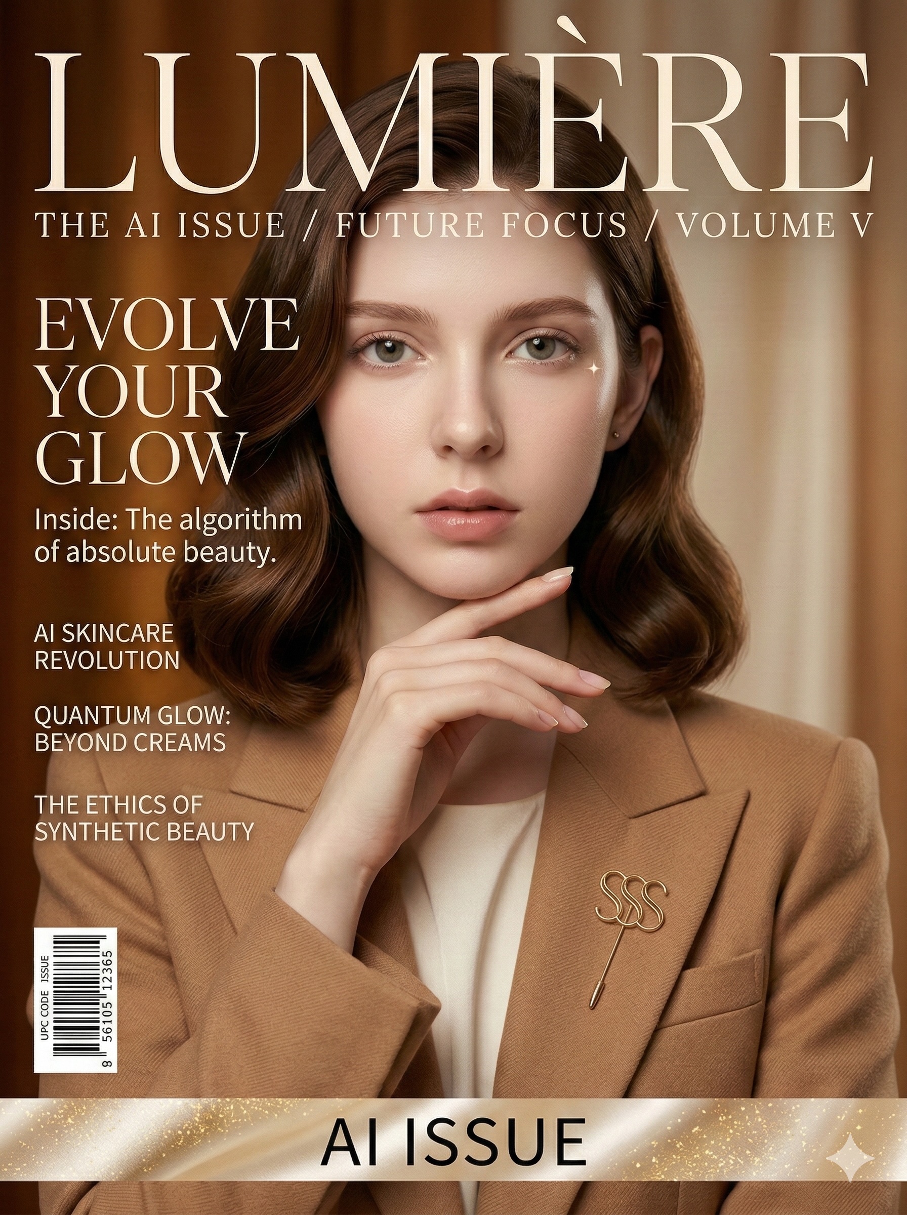 Featured on the mock cover of "LUMIÈRE," the AI virtual model adapts to a sophisticated, high-fashion aesthetic. The "SSS" logo is seamlessly integrated as a golden brooch, proving our AI virtual model retains its ID perfectly.