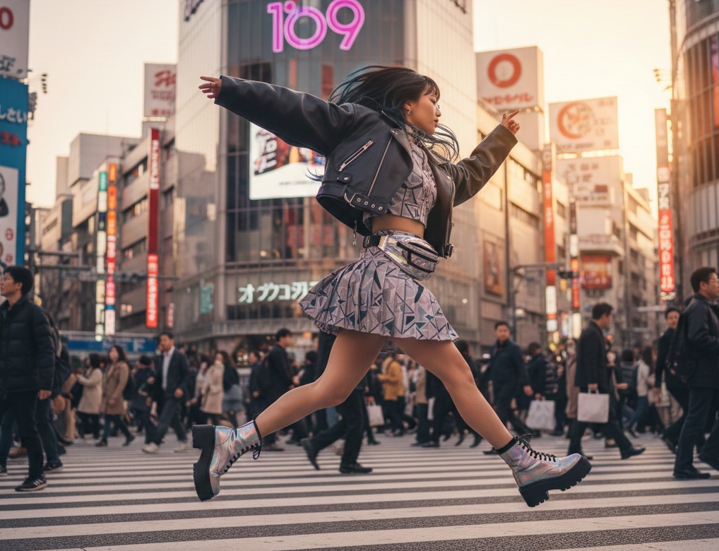 "A fashion photography shot of a stylish girl jumping in the air at Shibuya Crossing. She is frozen in a dynamic pose. Background is filled with blurred rushing crowds. Tokyo city lights, golden hour, 8k resolution, hyper-realistic, cinematic depth of field."